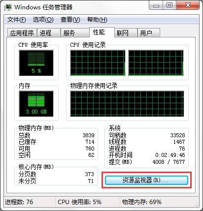 2、打开“任务管理器”界面后,切换到“性能”选项卡,点击“资源监视器”按钮,如图所示:
