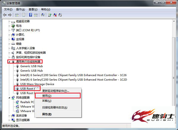 2。在Open Device Manager窗口中展开Universal Serial Bus控制器,右键单击第一个usb根集线器,然后单击Disable选项以断开USB驱动器,如下图所示: