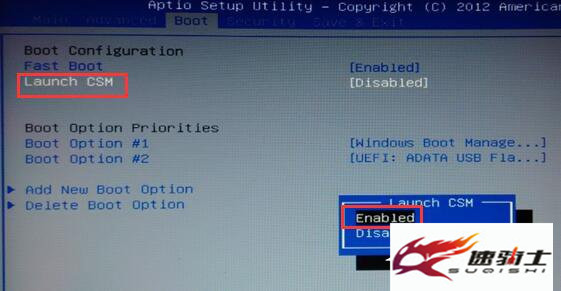 2。将光标移动到uefi bios菜单选项启动菜单,选择Launch CSM选项并将其设置为启用,如图所示: