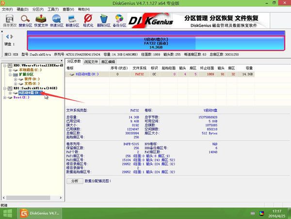 2,打开diskgenius软件,在分区工具的左侧找到开膛手病毒的u盘,单击u盘,如图所示: