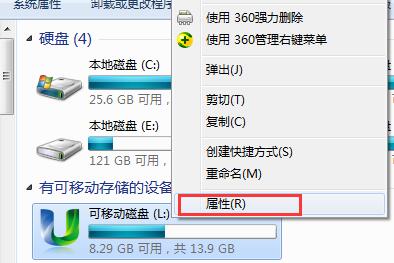 2。右键单击u盘,然后在菜单列表中选择属性选项,如图所示: