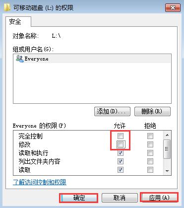 3每个人,将完全控制和修改相应的允许选项以取消选中标记,然后单击Apply-OK,如图所示: